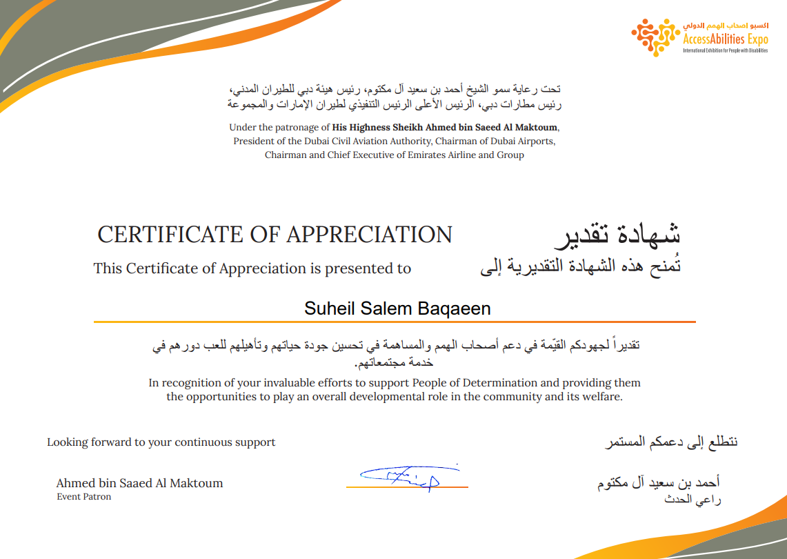 In the picture below is the Certificate of Appreciation that was presented to Suheil at a recent trade event under the patronage of His Highness Sheikh Ahmed bin Saeed Al Maktoum, President of the Dubai Civil Aviation Authority, Chairman of Dubai Airports, Chairman and Chief Executive of Emirates Airline and Group.